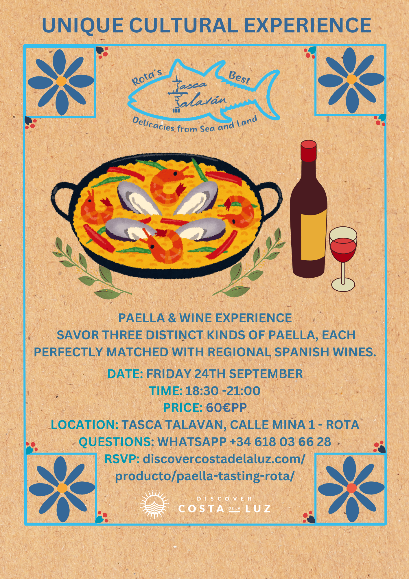 🥘 Friday, Sep 24th – Paella & Rice Delights: A Tasting Experience in Rota Ready to discover Spain’s most iconic dish in three mouthwatering versions? 🍷 Join us for an unforgettable evening of flavor, wine, and culture at Tasca Talaván.